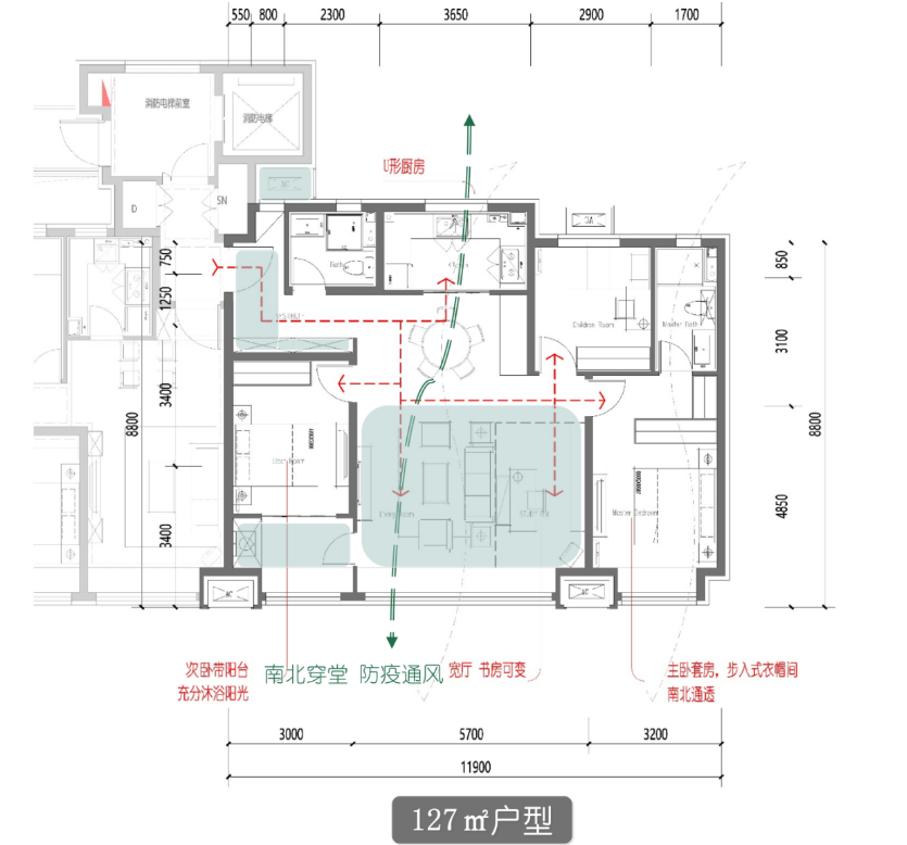 全能空间的另一位大将127㎡三室两卫,是一个配置5.7米超大宽厅的双阳卧户型。双阳卧均带飘窗,且其中一卧带阳台,内可纵享阳光、外可阅览四季美景。5.7米宽厅赋予改善客群更多空间组合的可能性。