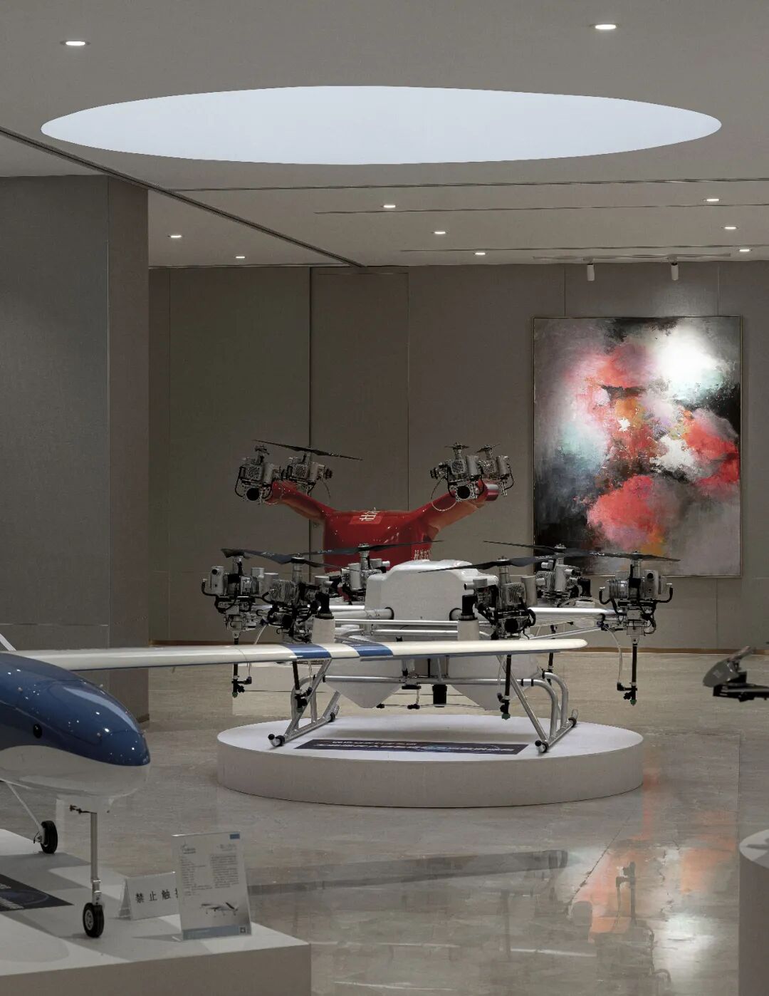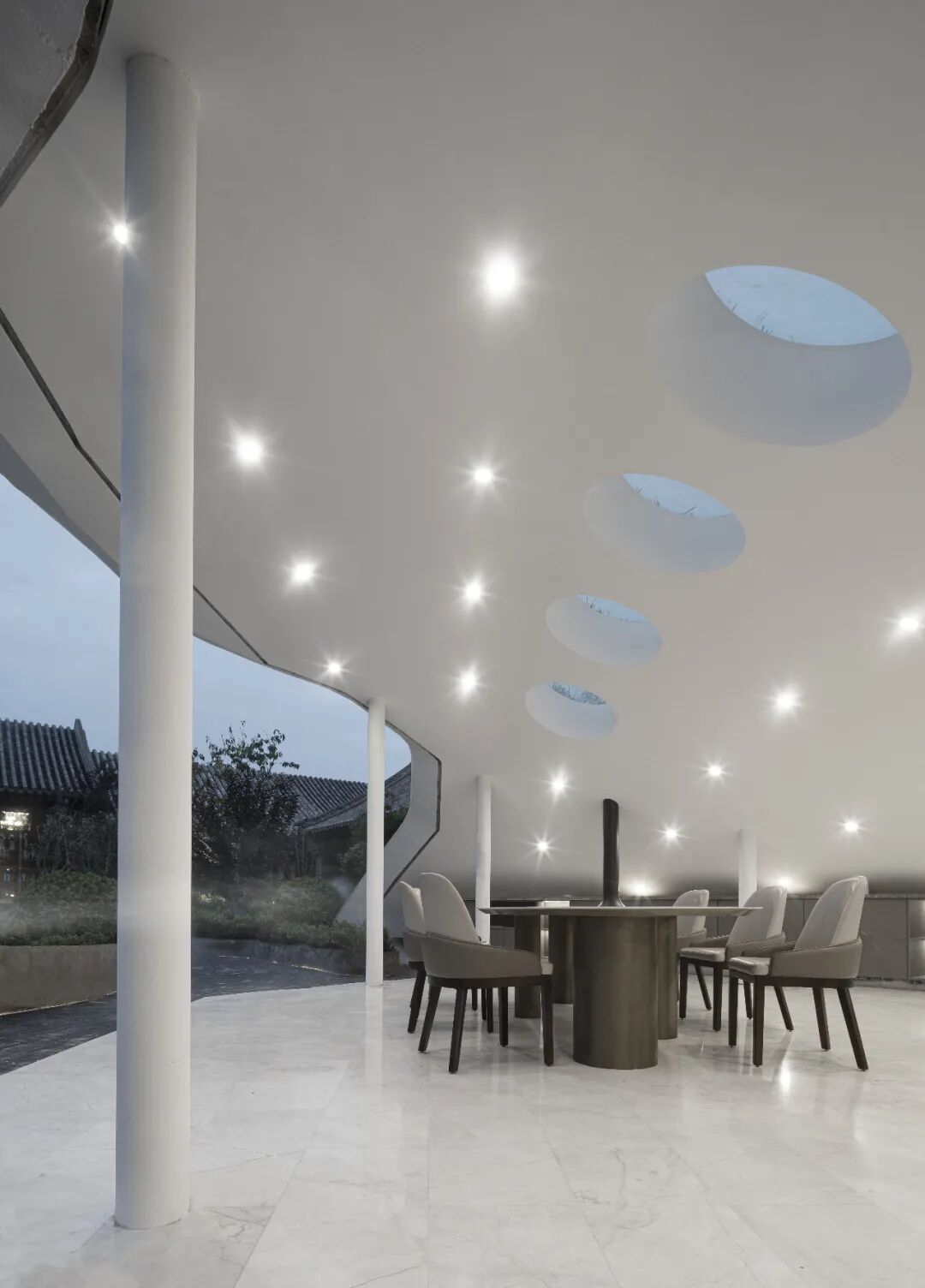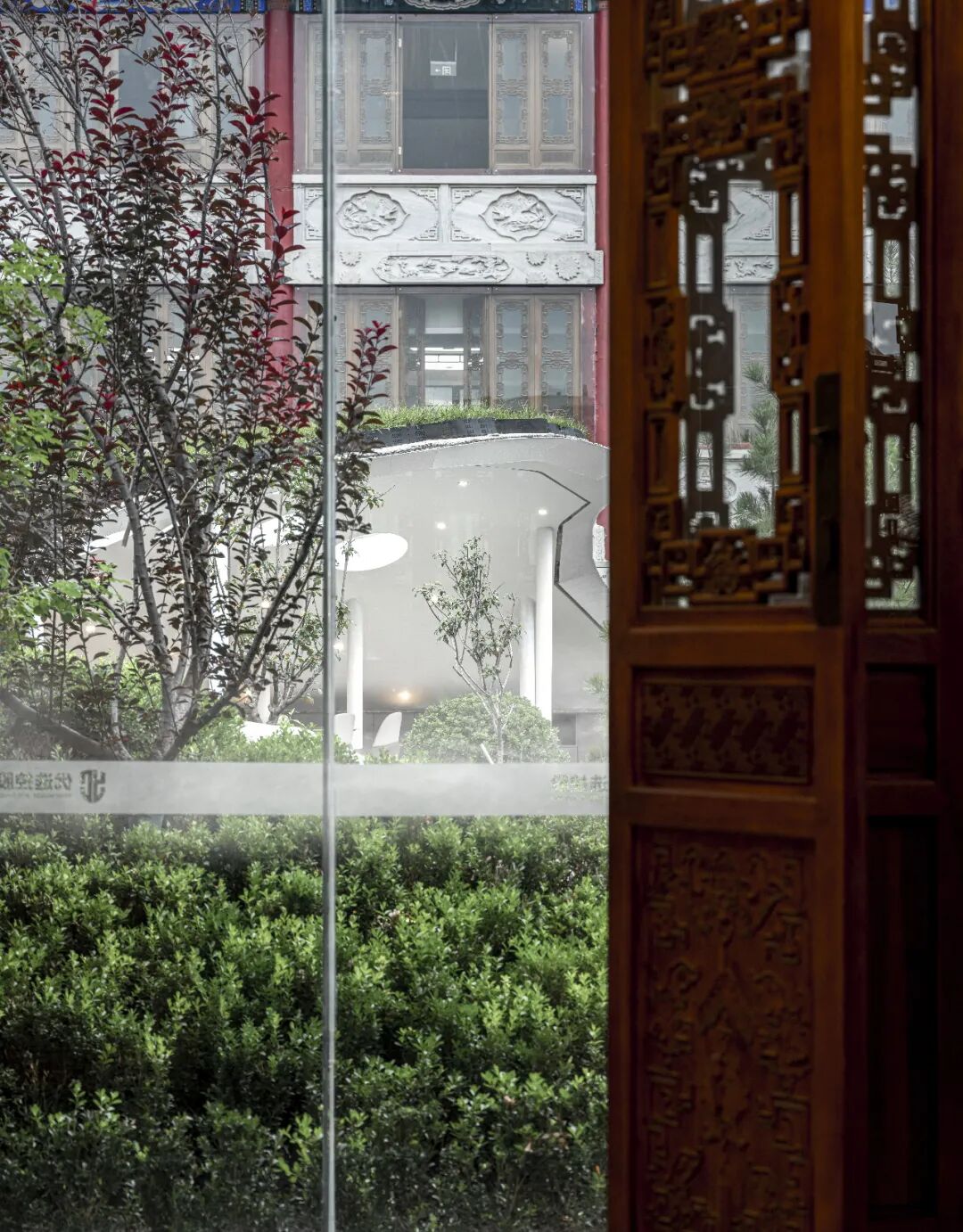 四合院楼体建筑为两层中式仿古建筑,局部为单层建筑,内部办公空间通过简约现代的设计形式,适应当代对办公功能与审美的双重需要;结合落地玻璃的通透性,一改传统建筑沉闷、闭塞的室内氛围。在办公楼地下区域特别开辟圆形天窗,为展示陈列厅导入光影,提升整体的透亮性。