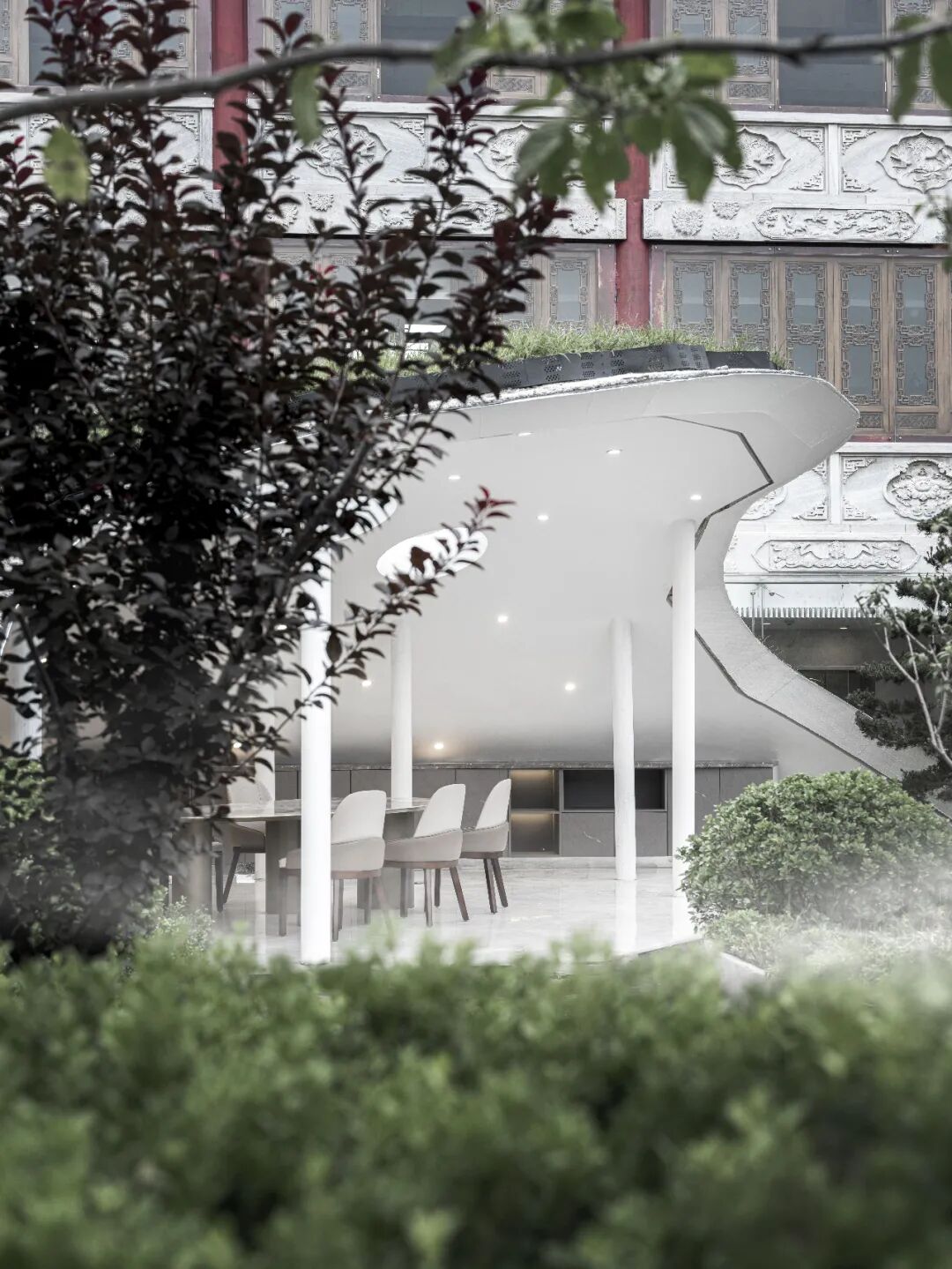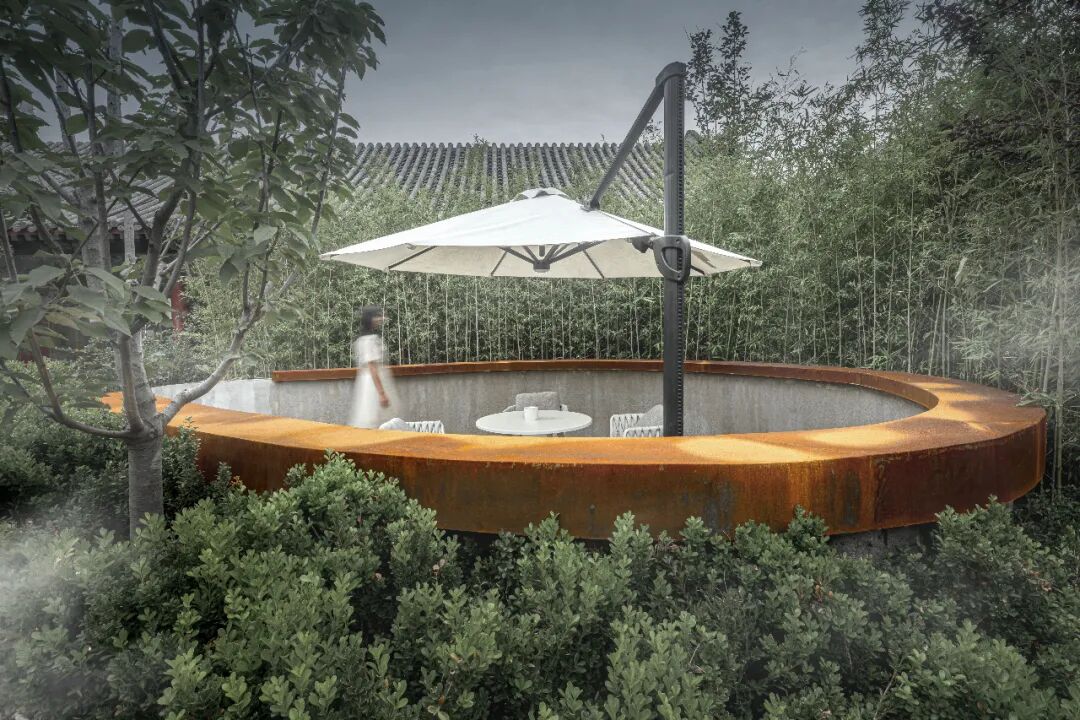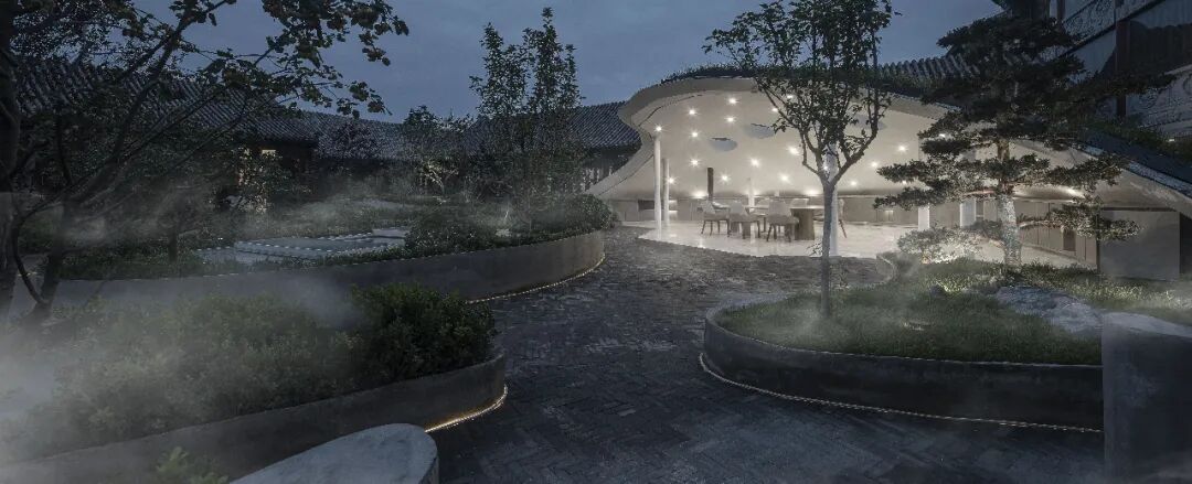 改造契合业主注重东方思想的经营哲学,融入传统“上善若水”理念,“水善利万物而不争,处众人之所恶”,水善于滋润万物却不与其争短长,停留在众人不愿去的低洼之地,诠释最高的处事和经营智慧,庭院设计借用水一样的曲线柔化方正秩序规律的传统建筑。