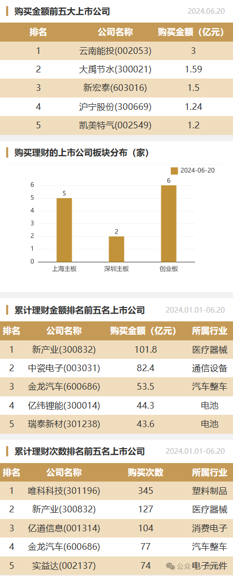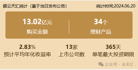 2024年06月20日,上市公司购买理财金额13.02亿元,共13家上市公司,理财产品34个,单笔最大投资期限365天。