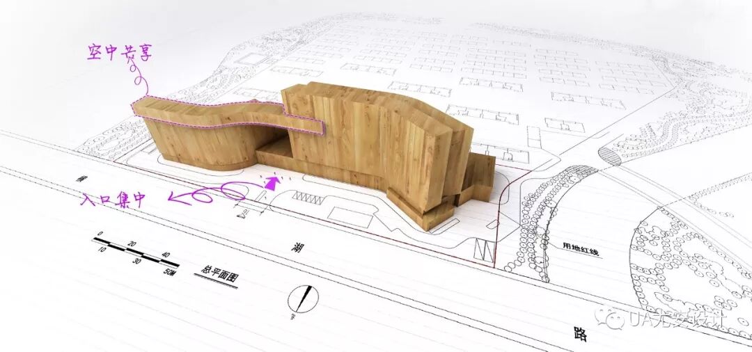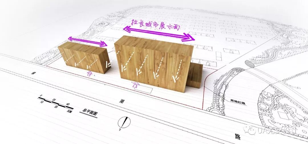 考虑到基地南侧、西南侧被住宅所遮挡,北侧、东侧景观条件更佳,我们确定沿横湖路为城市主要展示面。