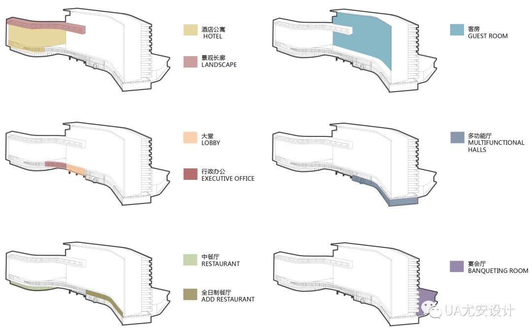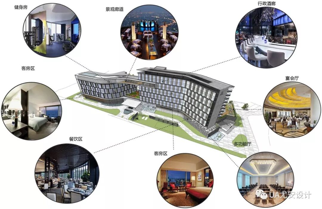 一二层为酒店公区,三层及以上标准层为酒店公寓及客房,另在顶层布置具有较好视野的景观长廊及健身房。酒店客房、公寓及宴会厅设置有各自独立的出入口,功能分区明确,同时避免了客人流线与后勤流线的相互干扰。