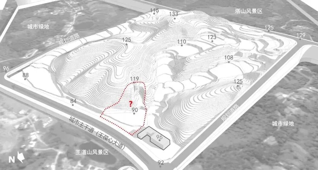 整个项目用地为丘陵地形,基地周边为城市绿地及风景区,北侧王葆心大道是唯一现状主干道。该生活艺术馆项目位于北侧靠近道路交叉口处,但主要人流来向的视野被加油站所遮挡,而生活馆对城市界面的昭示性需求与周边环境的遮蔽性质,成为了本案设计的主要冲突与难点。