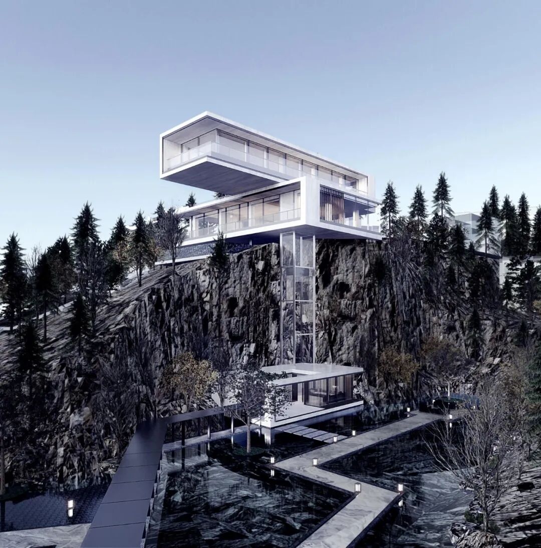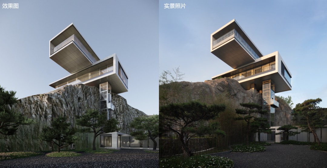 “盒与山石”,上立于悬崖之巅。这样赋有诗意的对话,最大程度的保留了原生自然环境与地貌,将建筑与自然用一种更为写意舒适的姿态,合到了一处。