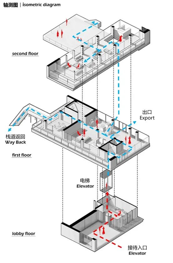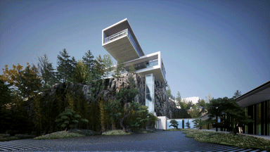 底层前场半开敞式的接待门厅,中间过渡的景观通廊与玻璃电梯,顶层双向悬挑建筑主体,整体以一条垂直交通,将底层的接待空间与山崖之上的两层休闲会谈空间串联起来,形成一条沿山崖而上的竖向流线。