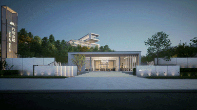 ▲寻山——风颂雅庭 | 入口区域回溯场地特征与空间导向关系,撷取山水之形为设计灵感,通过进院的传统手法来展现。