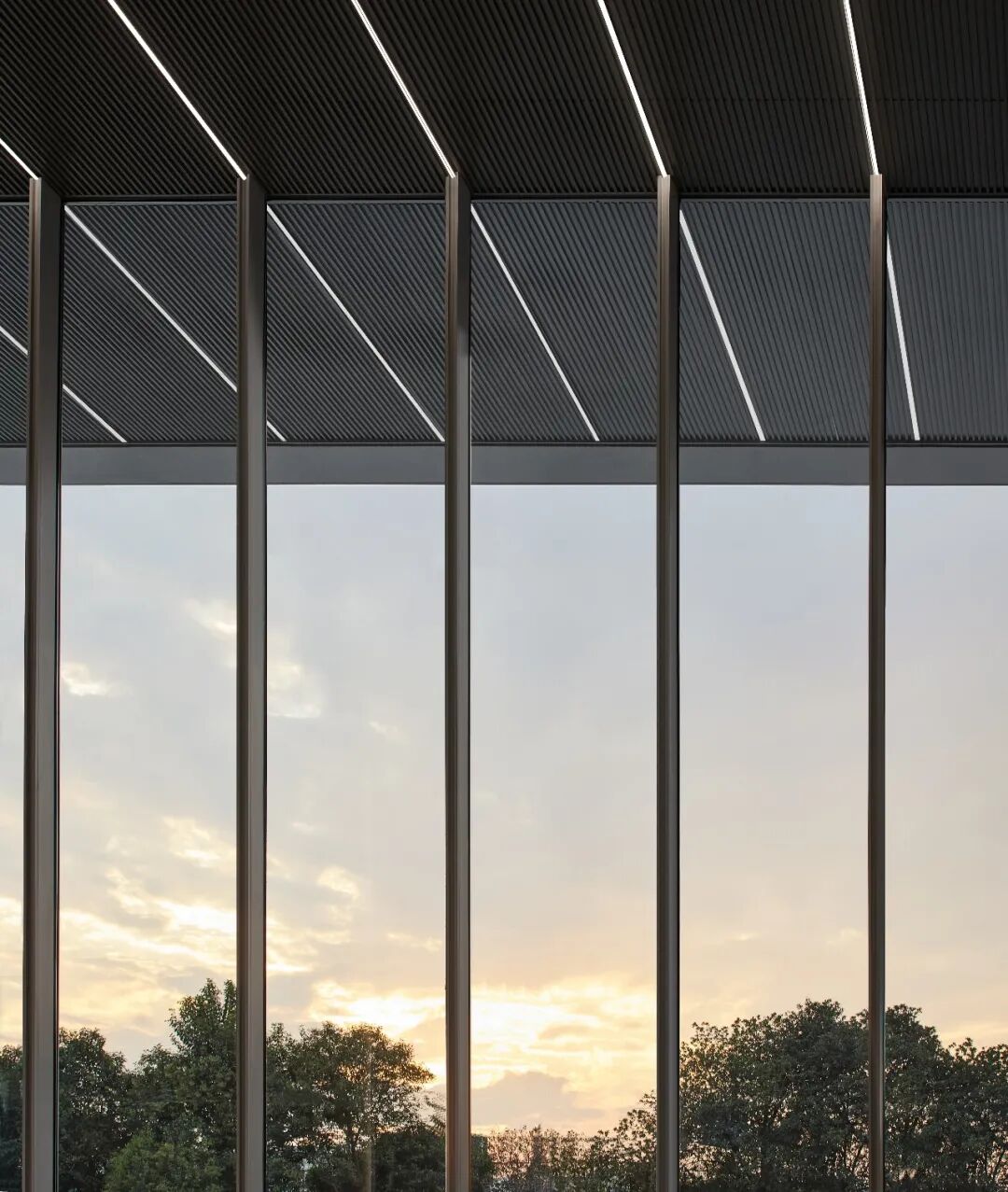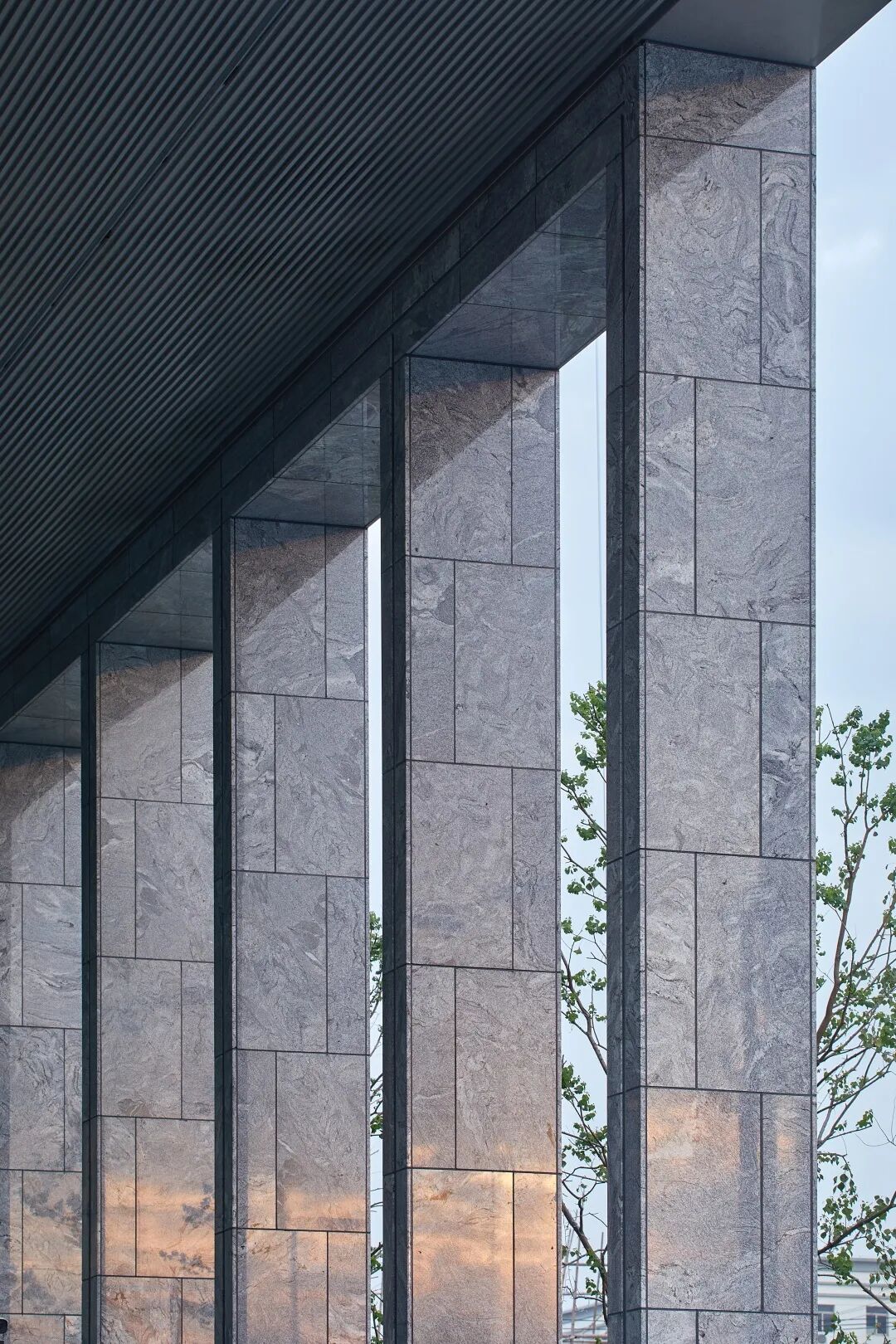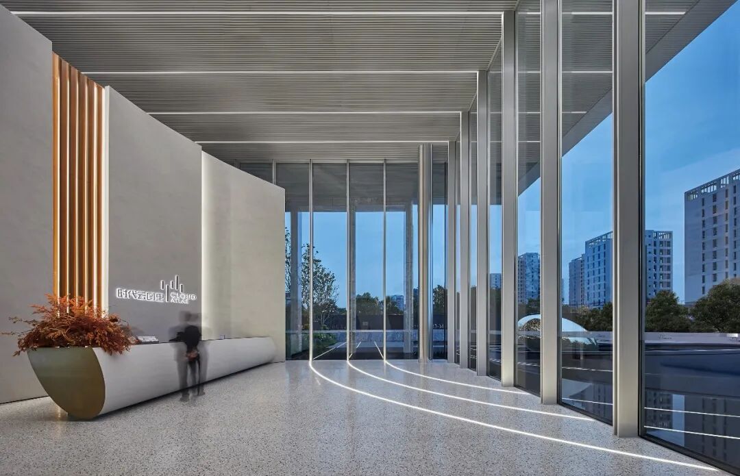 巨大的落地玻璃与传统墙体结构的幕墙搭配,在竖向线条的不同演绎下,简洁但富有细节变化,强调空间公共属性的同时,又减轻了视觉负担,营造出轻盈通透的未来感。