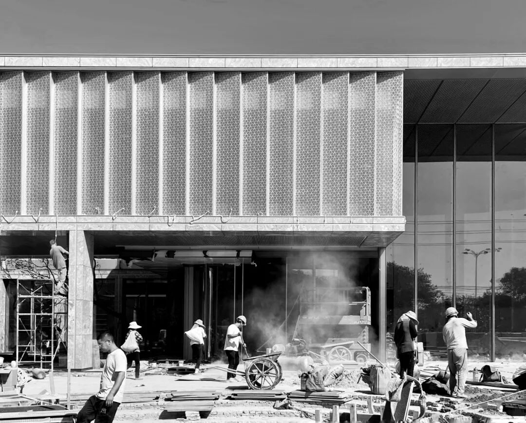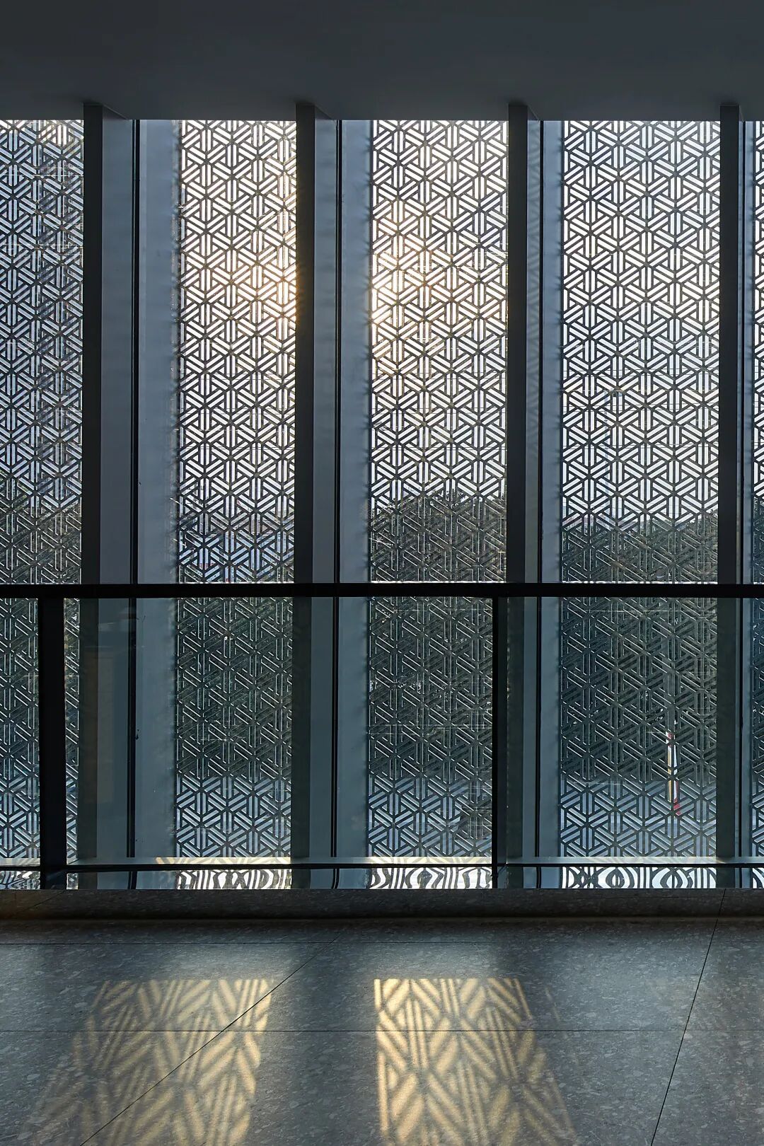 由穿孔金属板组成的建筑立面相较玻璃的透明性和金属石材的不透明性,穿孔金属板实现了二者之间的半透明效果,形成像纱一般的朦胧感,丰富了建筑表皮的表现力。交叠错落的设计,随光影变化,又极大地丰富了人的视觉体验。