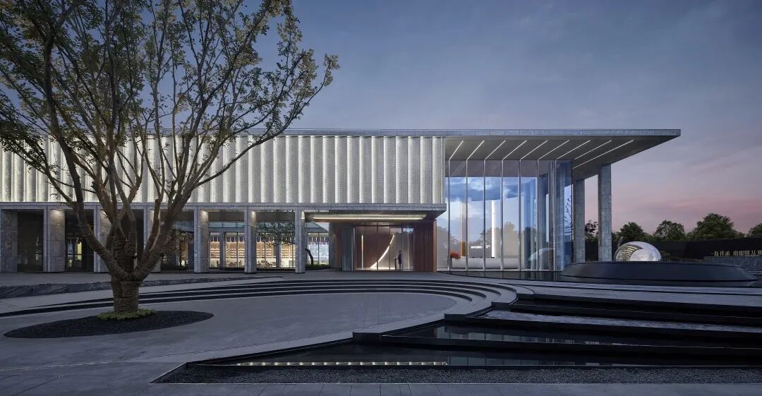 示范区作为本案的起点,同时作为城市一级界面展示的重要组成部分,设计首先从体块关系上进行回应。顺应基地边缘线,由内向外勾勒出不失细节却又舒展简练的建筑肌理。