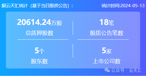 2024年5月13日,股票质押总质押股数2.06亿股,上市公司数5家,股质公告笔数18笔,股东数5个。