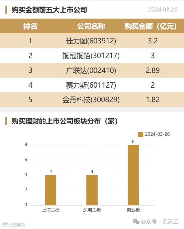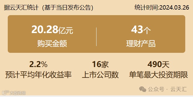 2024年03月26日,上市公司购买理财金额20.28亿元,共16家上市公司,理财产品43个,单笔最大投资期限490天。