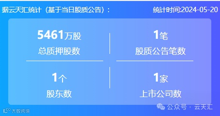 2024年5月20日,股票质押总质押股数0.55亿股,上市公司数1家,股质公告笔数1笔,股东数1个。