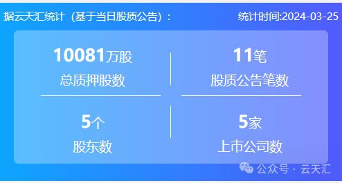 2024年3月25日,股票质押总质押股数1亿股,上市公司数5家,股质公告笔数11笔,股东数5个。