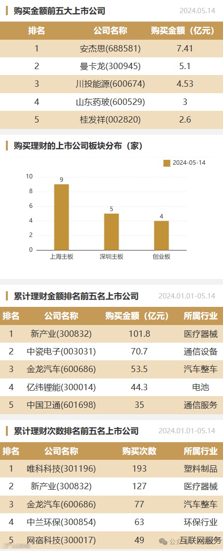 2024年05月14日,上市公司购买理财金额32.3亿元,共19家上市公司,理财产品41个,单笔最大投资期限1095天。