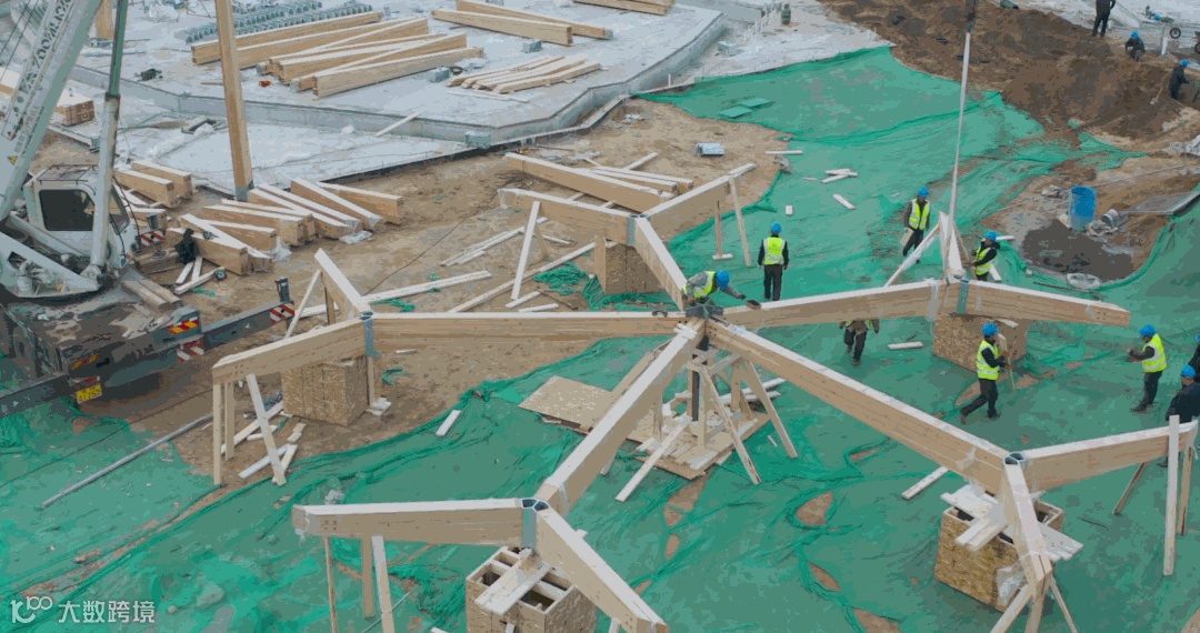 ▲预制木结构“梨花”形屋顶整体吊装 ©加拿大木业