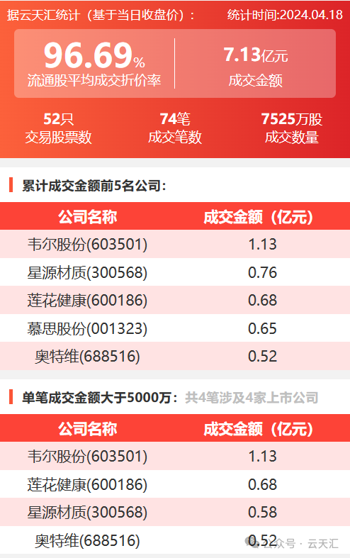 2024年4月18日,大宗交易成交金额7.13亿元,交易股票数52只,成交笔数74笔,流通股平均成交折价率96.69%,成交数量7525万股。