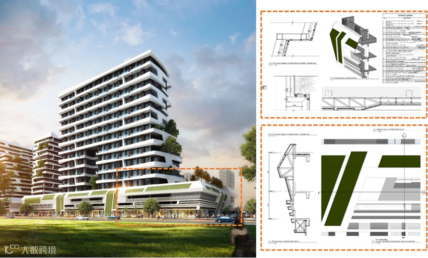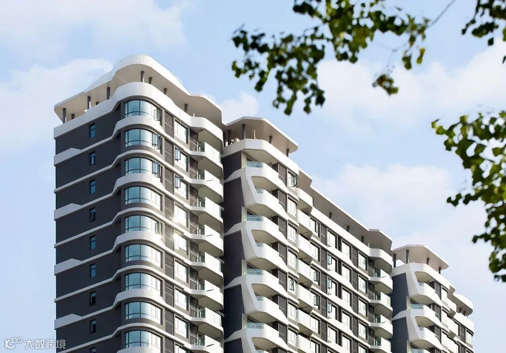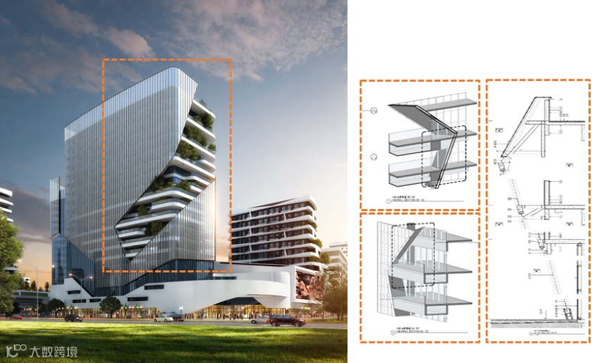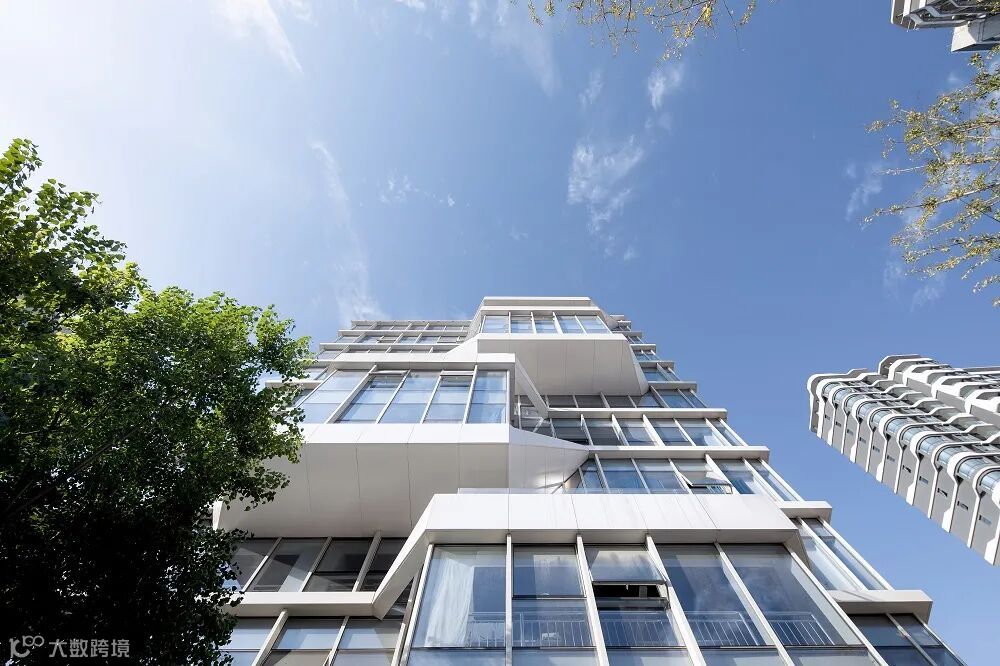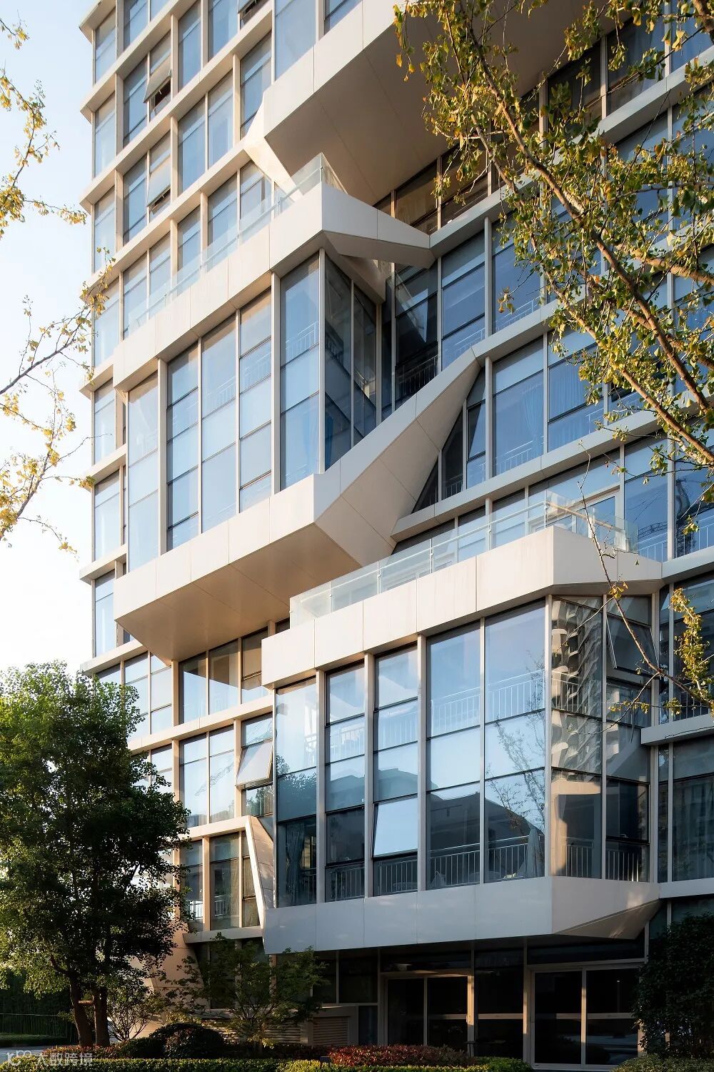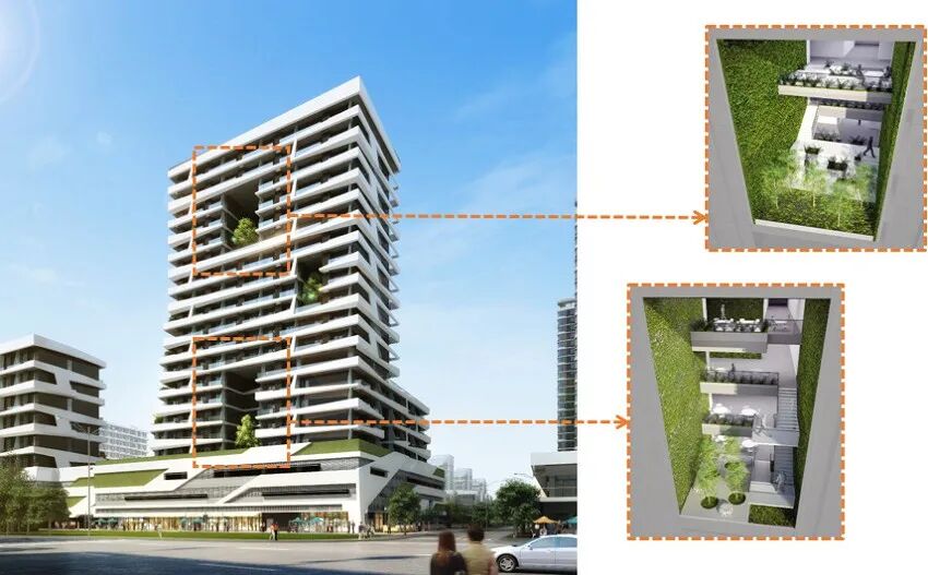 竖向绿化。建筑物造型结合自身体量形成高低错落的立面轮廓,加强在纵向上的节奏性,内外交织成一幅错落有致的城市画面。