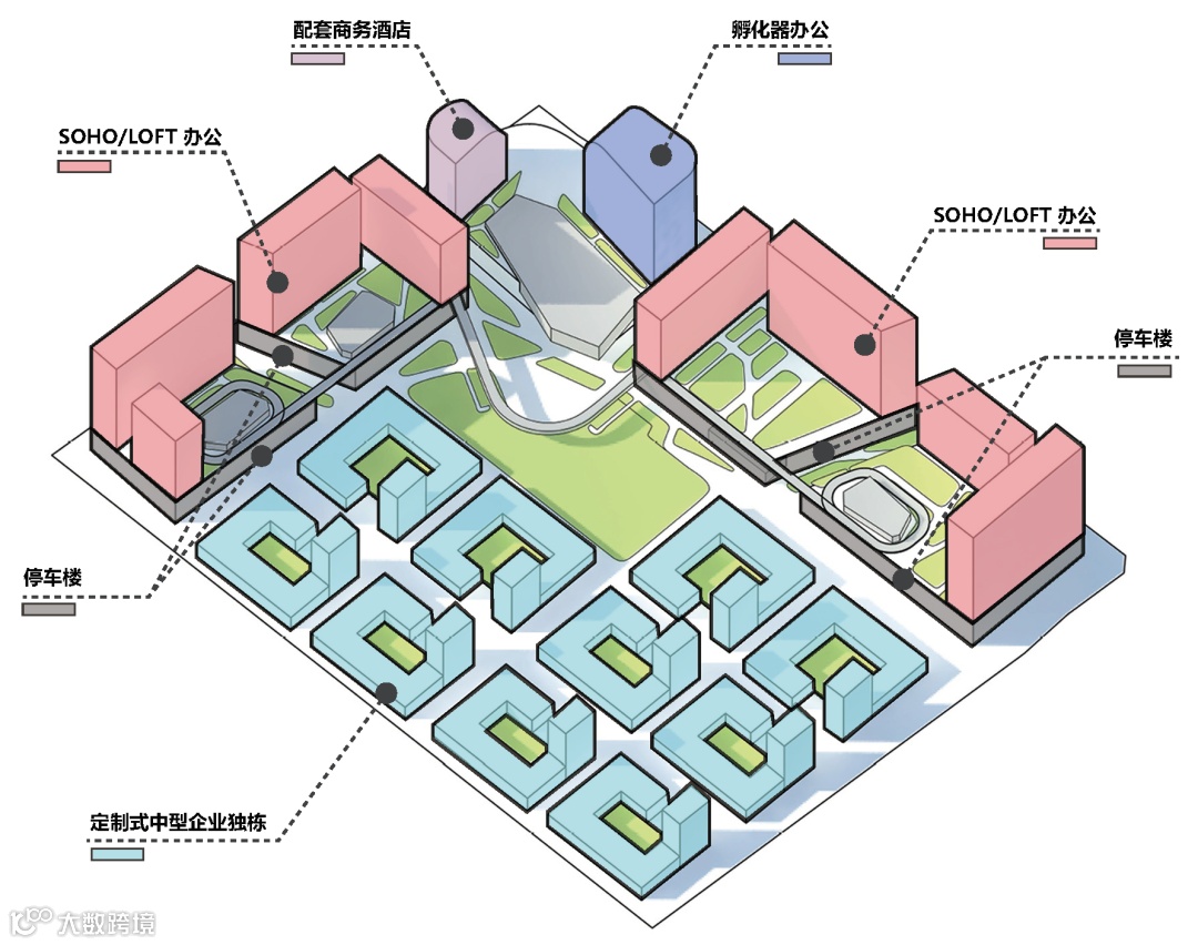 ▲在西亚斯科技园项目,筑弧探索从传统商住体量到独院商住体量的转换