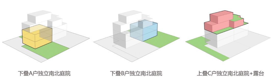 建筑的中上层体量前后拉开,留出院落空间,这样上中下叠都有更大更完整的庭院。
