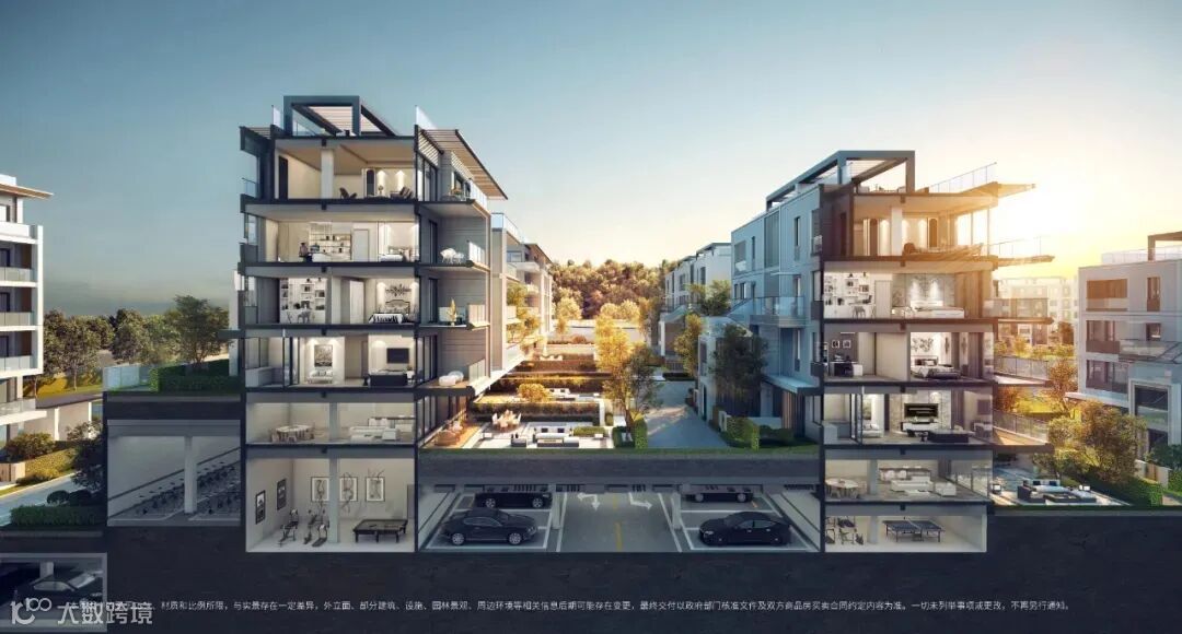 一些叠墅项目因坡地南北高差,形成全明首层“地下空间”,阳光穿过南向庭院映入室内,南北双庭院设计、270°瞰景阳台等设计。