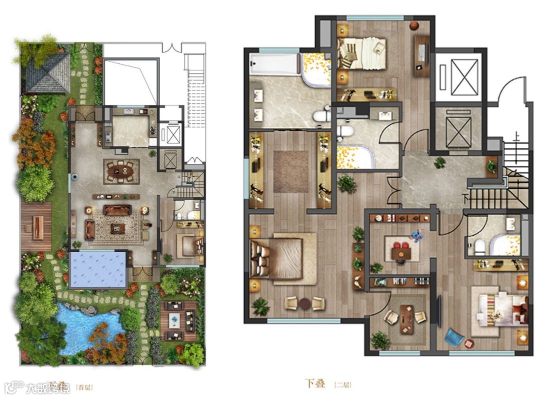 再如保利春晓叠墅,首层地面双庭院设计,上叠和下叠各拥有一个私家花园。上叠住户还享有空中露台。