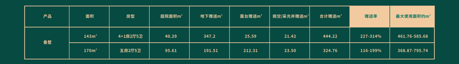 中海叠墅赠送面能达到400多㎡,约300%的超大赠送面积,每户赠送面积约有庭院、地下空间、露台等空间,赠送面积几乎高达实际购买面积的一倍!