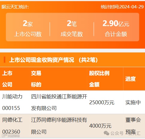 2024年4月29日,资产交易成交金额2.9亿元,上市公司2家,成交2笔,上市公司现金收购资产2笔。