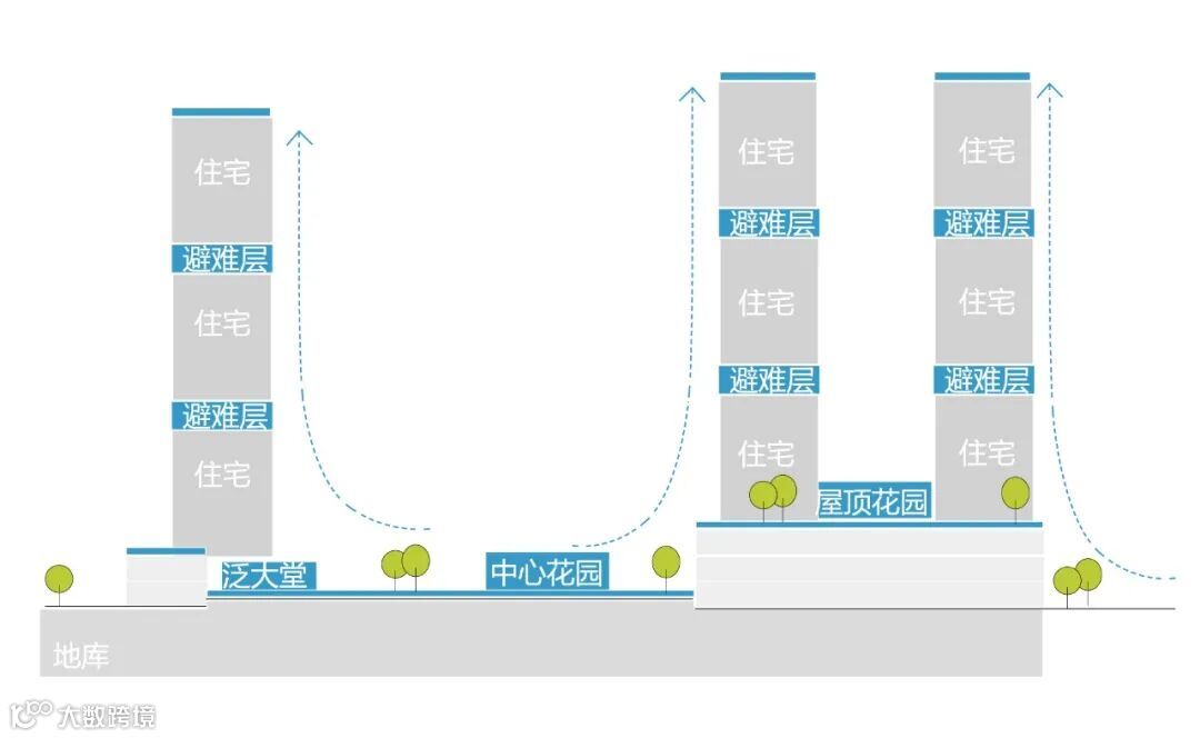 此外植入多层次绿地空间,弥补高容高密社区生态环境缺失,利用架空层、避难层、屋顶层植入立体花园,增加绿化率,提供休闲场所,从而打造自然宜居的生活场所。