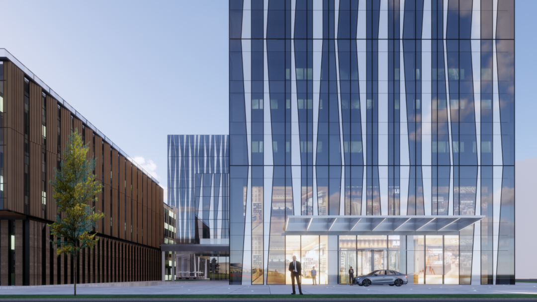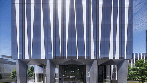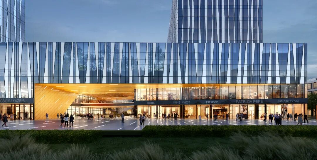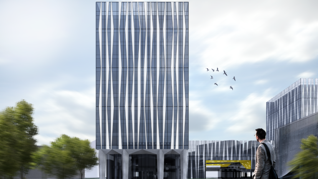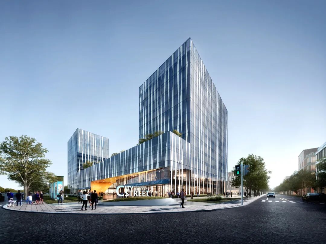 高层办公塔楼在浅色玻璃幕墙上塑造出抽象的水文肌理,每一块肌理单元变形于古文中的“水”字,东方文化与诗意融入其中。