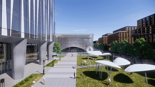 展示中心位于园区的核心位置,其波动的曲线立面形成视觉焦点,与中心广场一起成为整个园区的“引力场”,灵活满足展览、音乐会、舞台演出或大型集会等不同的使用需求。