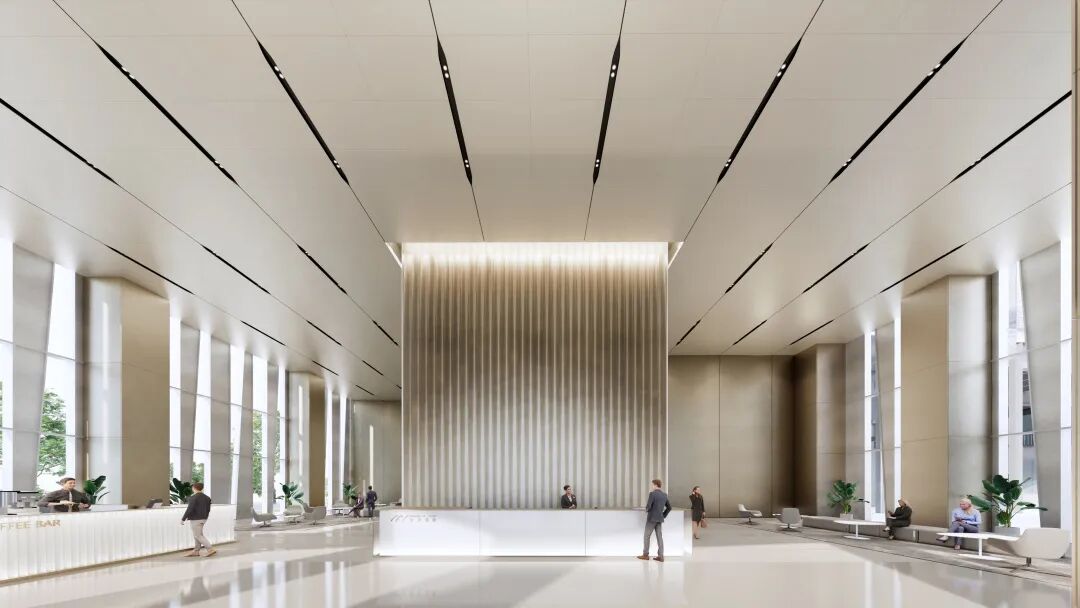 高层办公大堂内部延用了海洋元素,无论是如水幕般的前台屏风,还是具有流动感的墙面、天花板,都营造出温馨、轻松的水边会客厅既视感。