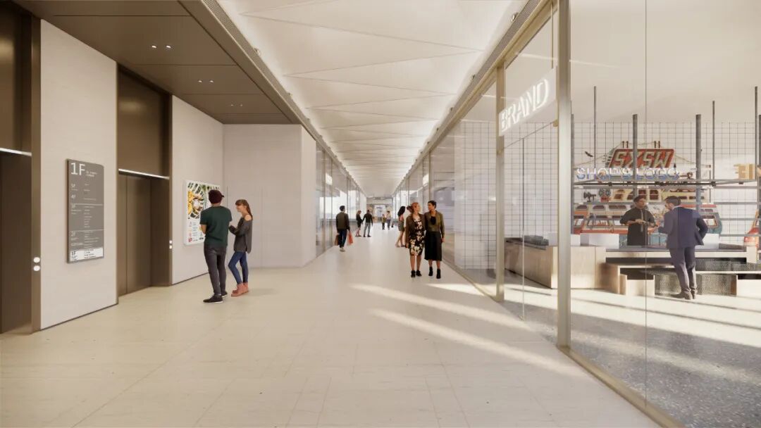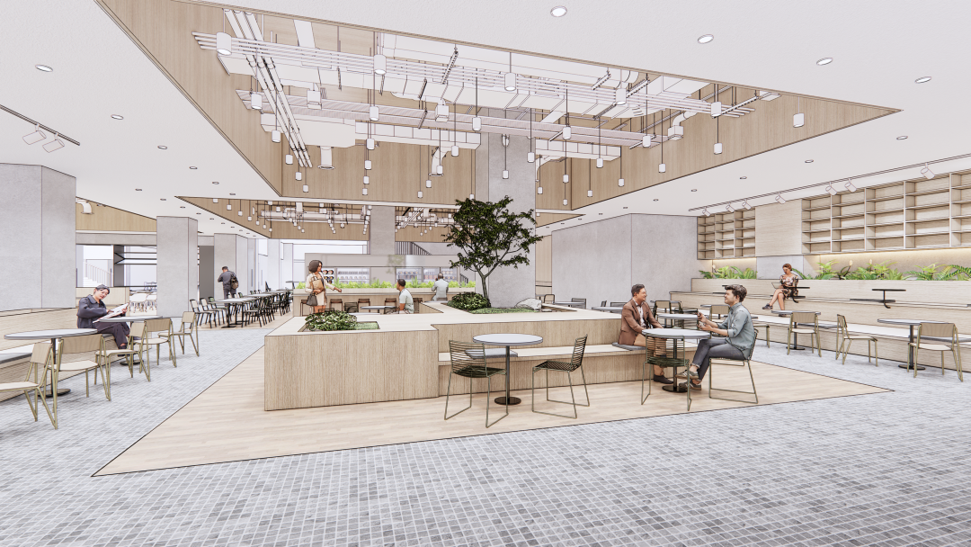 下沉式庭院提供餐饮等不同需求的配套,将室外元素及绿植引入室内,模糊室内外空间界限,削弱地下空间感受,营造了一个轻松休闲、充满生活氛围的地下城。