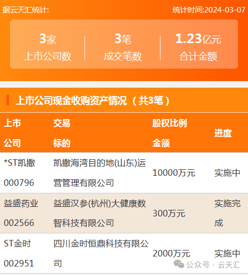 2024年3月7日,资产交易成交金额1.23亿元,上市公司3家,成交3笔,上市公司现金收购资产3笔。