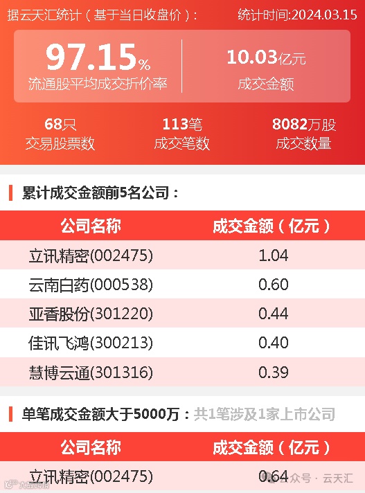 2024年3月15日,大宗交易成交金额10.03亿元,交易股票数68只,成交笔数113笔,流通股平均成交折价率97.15%,成交数量8082万股。