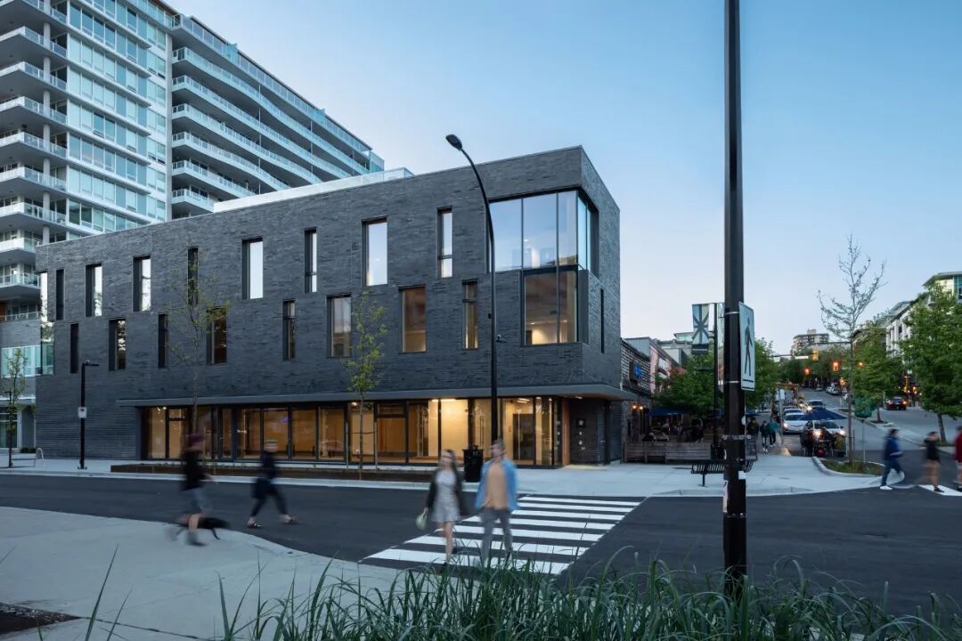 The intent of the design was to create a contemporary interpretation of the brick-clad, heavy timber, warehouse buildings that formed the backbone of the working waterfront. Along with the sustainable ambitions for the project, the new building presents the Lower Lonsdale District with the familiarity and ‘grounded’ feeling of a dark, glazed brick building that reads as a ‘skin’ for the mass timber frame, as opposed to a traditional ‘solid mass’ building. The fenestration on the building’s upper two floors has been ‘randomly’ distributed to offer visual interest and relief from the predictable facades typical in commercial buildings. Special attention has been given to signify the corner of Lonsdale Avenue and Carrie Cates Court by eroding the brick facade on the upper floors to express the mass timber structure through a PH curtainwall system while offering the upper floor occupants stunning views of Vancouver harbour.