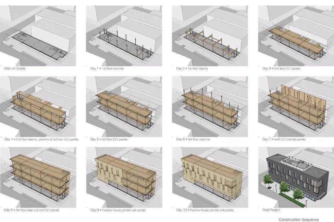 All this said, the most remarkable aspect of the project is the innovations in prefabrication and mass timber construction methodologies. The project faced a number of building code challenges including the use of a CLT and glulam structure and the need for a zero lot line ‘non-combustible party wall. Factoring in the complexity of PH airtightness and restricted thermal bridging requirements, a system of pre-fabricated insulated, 2x8 vertical wall panels was used for the three ‘visible’ sides of the building. A series of CLT panels with the membrane, exterior insulation, and cladding pre-installed were then used to create the north wall whilst providing the necessary fire rating.