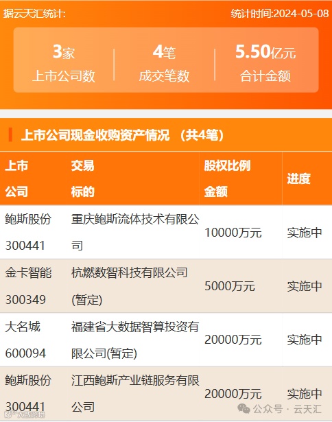 2024年5月8日,资产交易成交金额5.5亿元,上市公司3家,成交4笔,上市公司现金收购资产4笔。