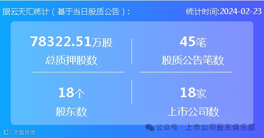 2024年2月23日,股票质押总质押股数7.83亿股,上市公司数18家,股质公告笔数45笔,股东数18个。