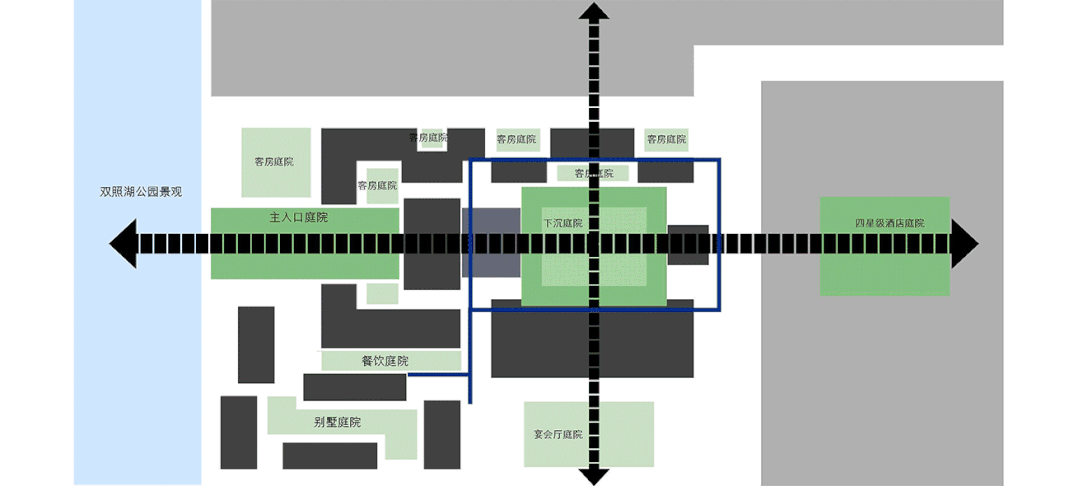 整体酒店群着重于打造类度假酒店的精品,规划策划采用园林景观手法,给宾客以尊享的体验感。宏大工整的布局,强调古代宫殿、园林建筑中轴线的统治力——南宫北市、十字中阙。