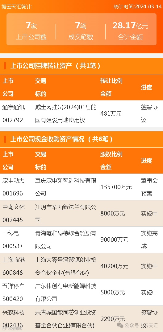2024年3月14日,资产交易成交金额28.17亿元,上市公司7家,成交7笔,上市公司挂牌转让资产1笔,现金收购资产6笔。