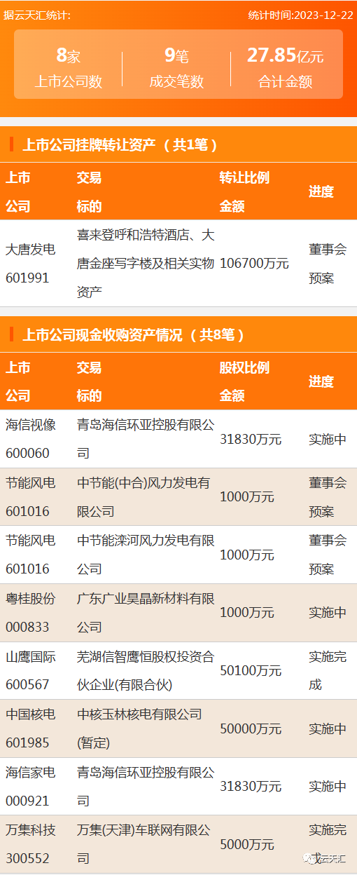 2023年12月22日,资产交易成交金额27.85亿元,上市公司8家,成交9笔,上市公司挂牌转让资产1笔,现金收购资产8笔。