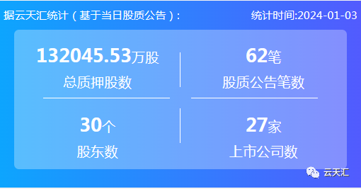 2024年1月3日,股票质押总质押股数13.20亿股,上市公司数27家,股质公告笔数62笔,股东数30个。