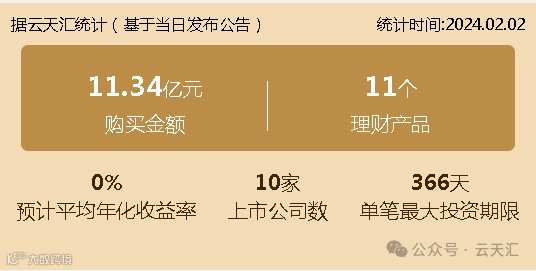 2024年02月02日,上市公司购买理财金额11.34亿元,共10家上市公司,理财产品11个,单笔最大投资期限366天。
