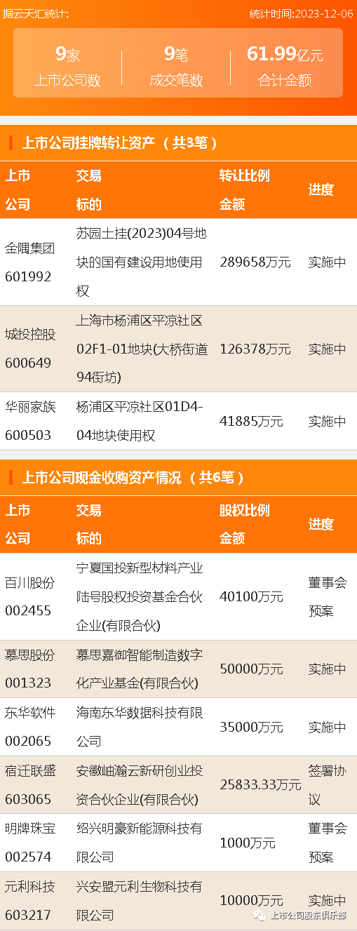 2023年12月6日,资产交易成交金额61.99亿元,上市公司9家,成交9笔,上市公司挂牌转让资产3笔,现金收购资产6笔。