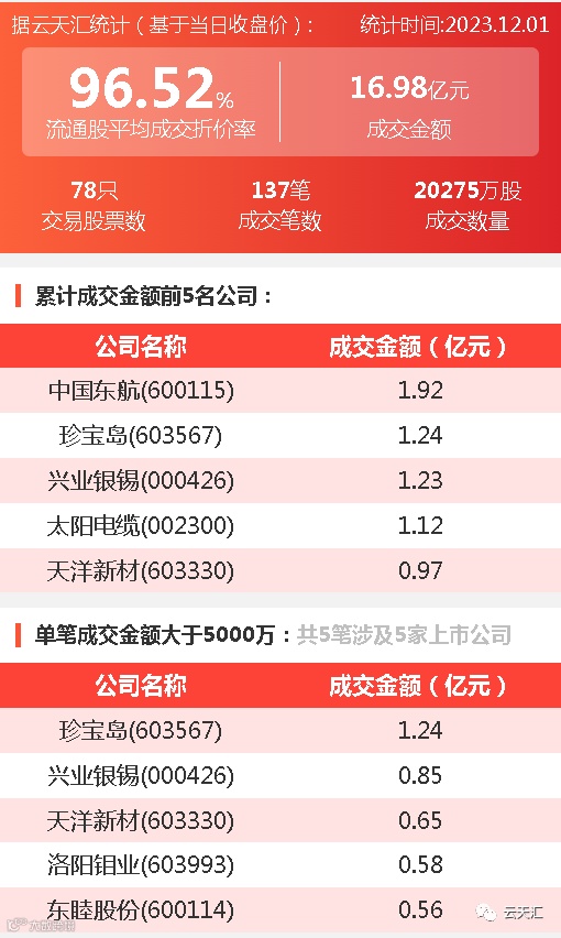 2023年12月1日,大宗交易成交金额16.98亿元,交易股票数78只,成交笔数137笔,流通股平均成交折价率96.52%,成交数量20275万股。