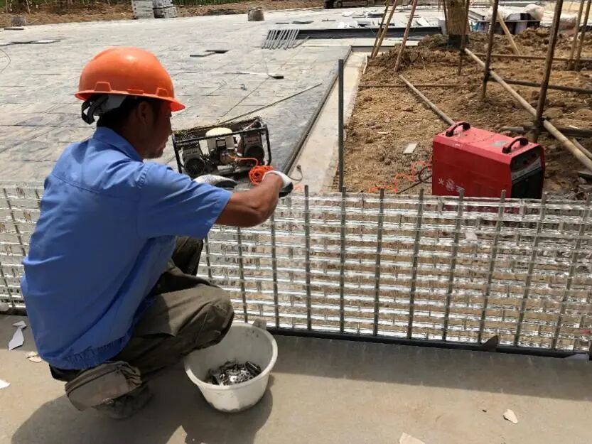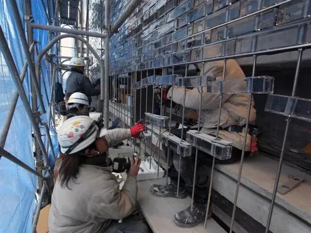 还有一些实心玻璃砖在制作中会加入两个孔,安装时,先在垂直上方加钢筋,然后像串糖葫芦一样一个一个往上串,每串10cm横向嵌入一个金属棒分摊受力。