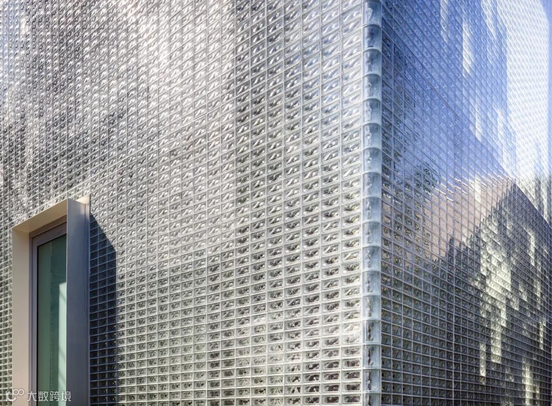 白天玻璃外墙在阳光照耀下反射出不同弧度的光线,闪着耀眼的光,使人目眩。夜晚在玻璃砖后置LED灯光的照射下,整个建筑被衬托出高冷范,时尚感十足。