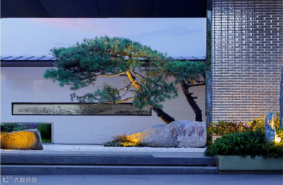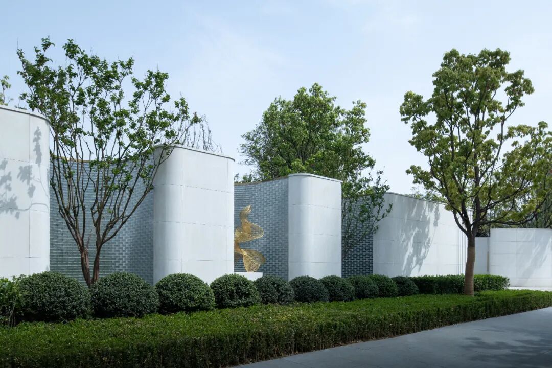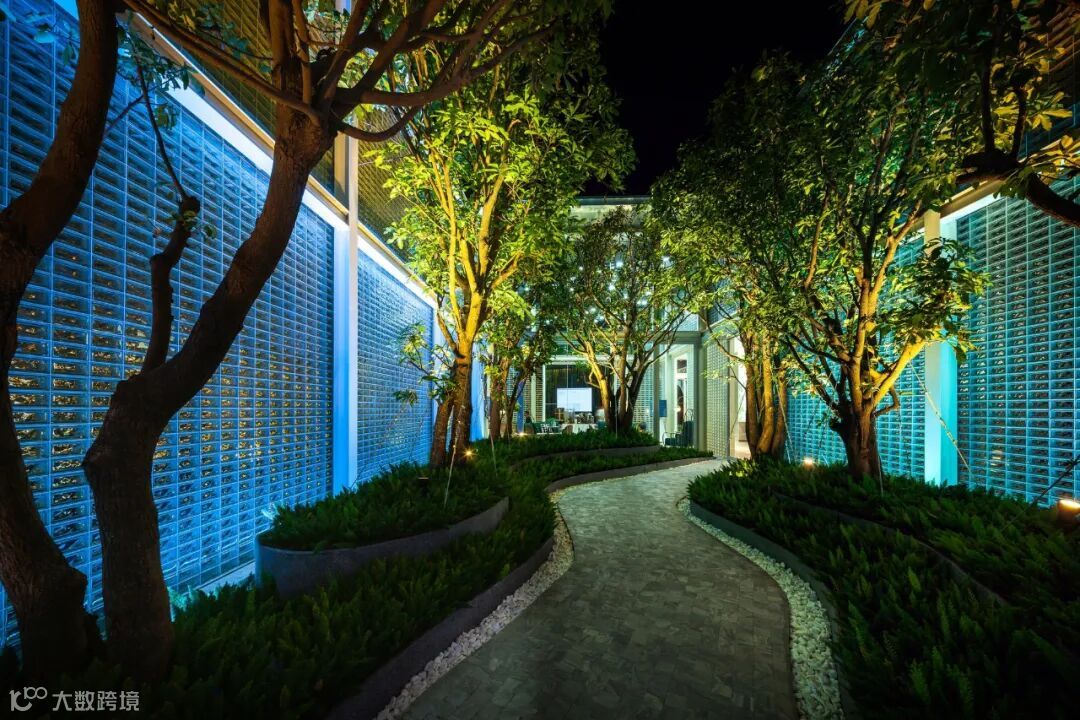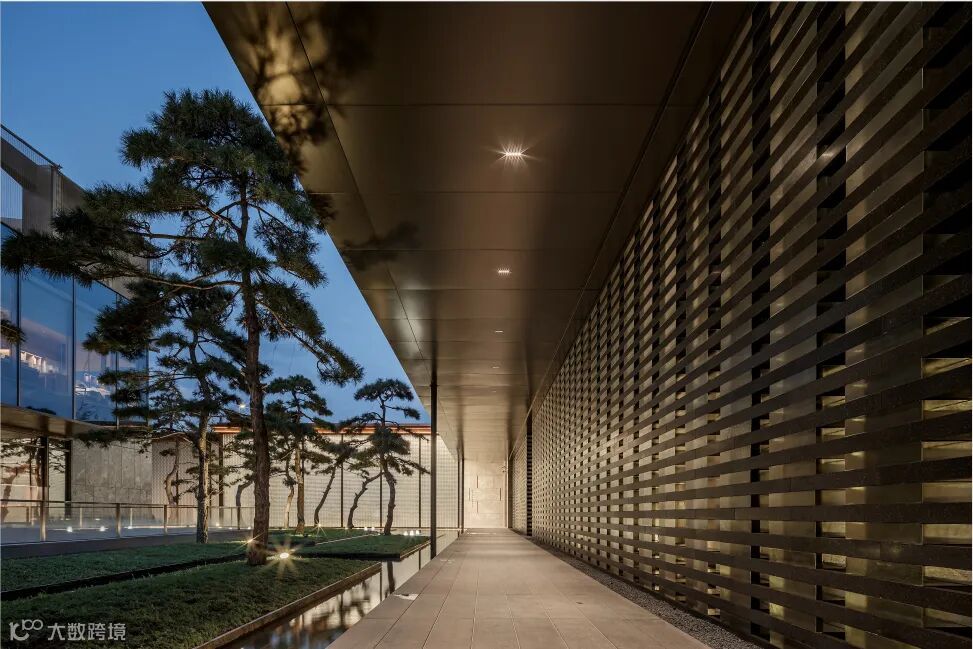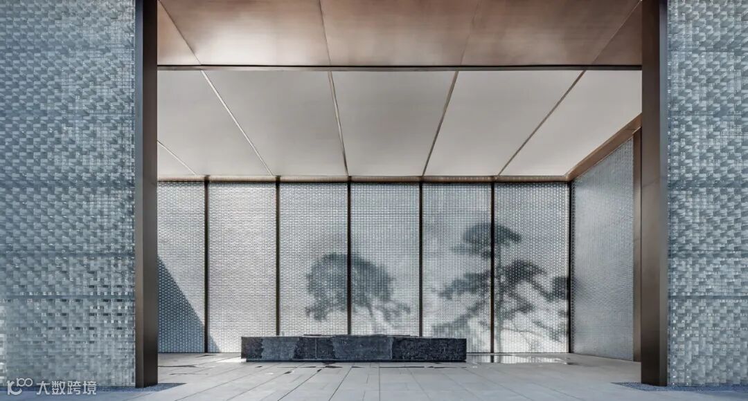 橱窗式景墙将整个城市界面切割,内外借景渗透,融合自然之景,呈现出整体静谧的都市空间。