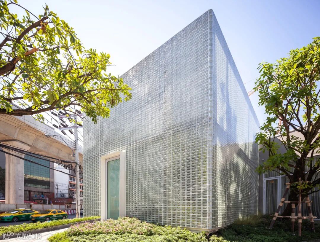 曼谷的一个公寓项目的售楼处,外立面有大约 20,000 个玻璃块,该项目使用的玻璃块是矩形的,而不是传统的方形类型。它们还有延伸的边缘或翼,以覆盖大部分灌浆,将宽度减少到 2 毫米,而不是像往常一样的 10 毫米。