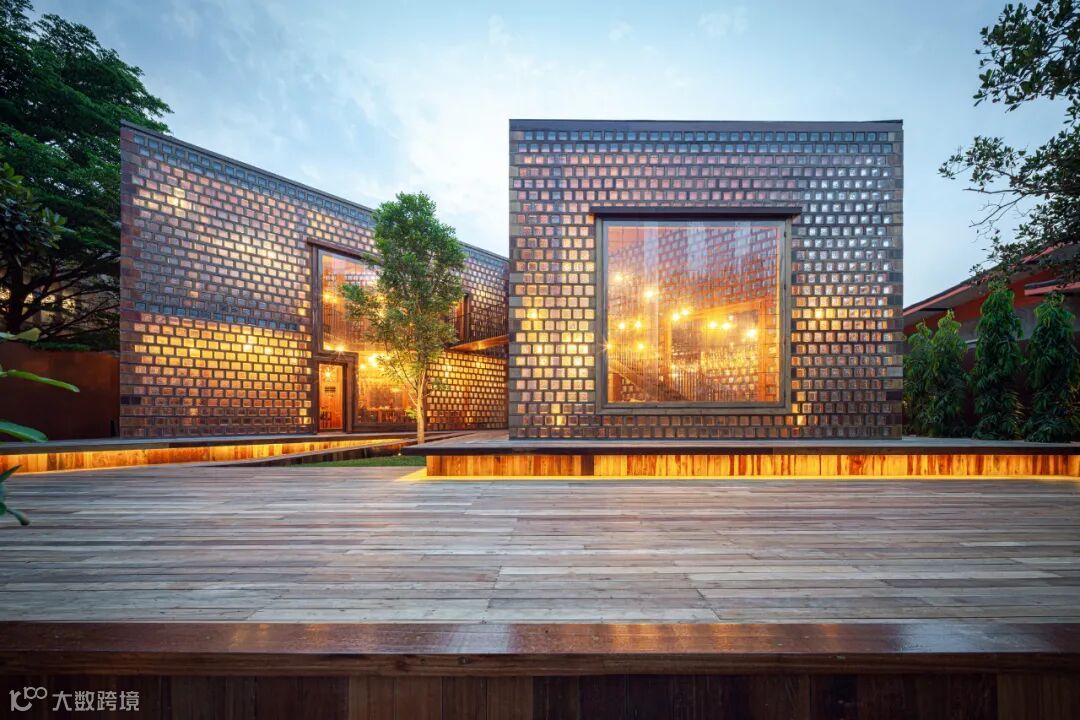 泰国的一个餐厅,五栋建筑,外立面与通常的玻璃砖砌块墙的建造方式不同,在这个项目中,使用钢作为砂浆并用木头覆盖玻璃砖,五座玻璃砌块建筑在灯光的照耀下日夜闪闪发光。